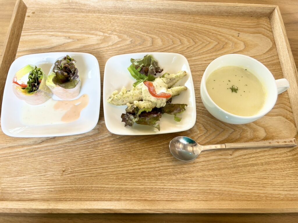ランチメニューは前菜3品と、メインを1品選んで、お好みでデザートとドリンクもつけられるようです。